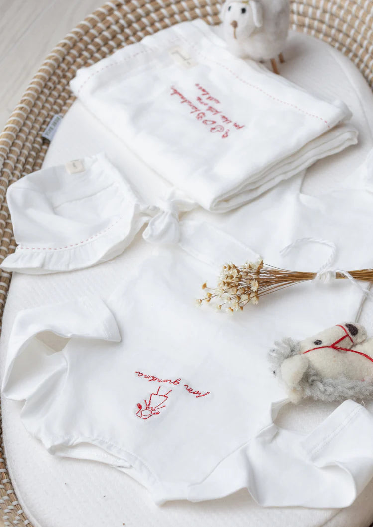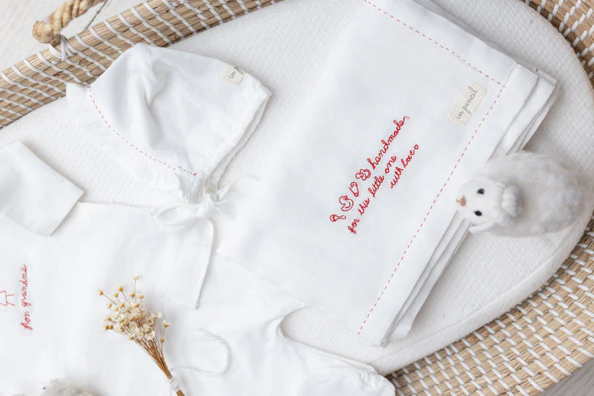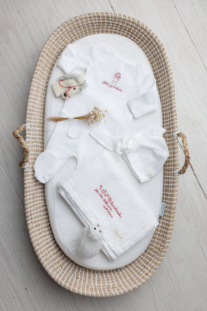 Presented in an elegantly enveloped hand-embroidered packet, this thoughtfully curated layette set captures the joy of grandmotherly love. The collection features a sumptuous footie, coordinating bonnet, and swaddle—each piece adorned with intricate hand embroidery that transforms everyday essentials into cherished keepsakes. An ideal gift for the grandmother eager to welcome her newest grandchild with sophistication and heartfelt sentiment.